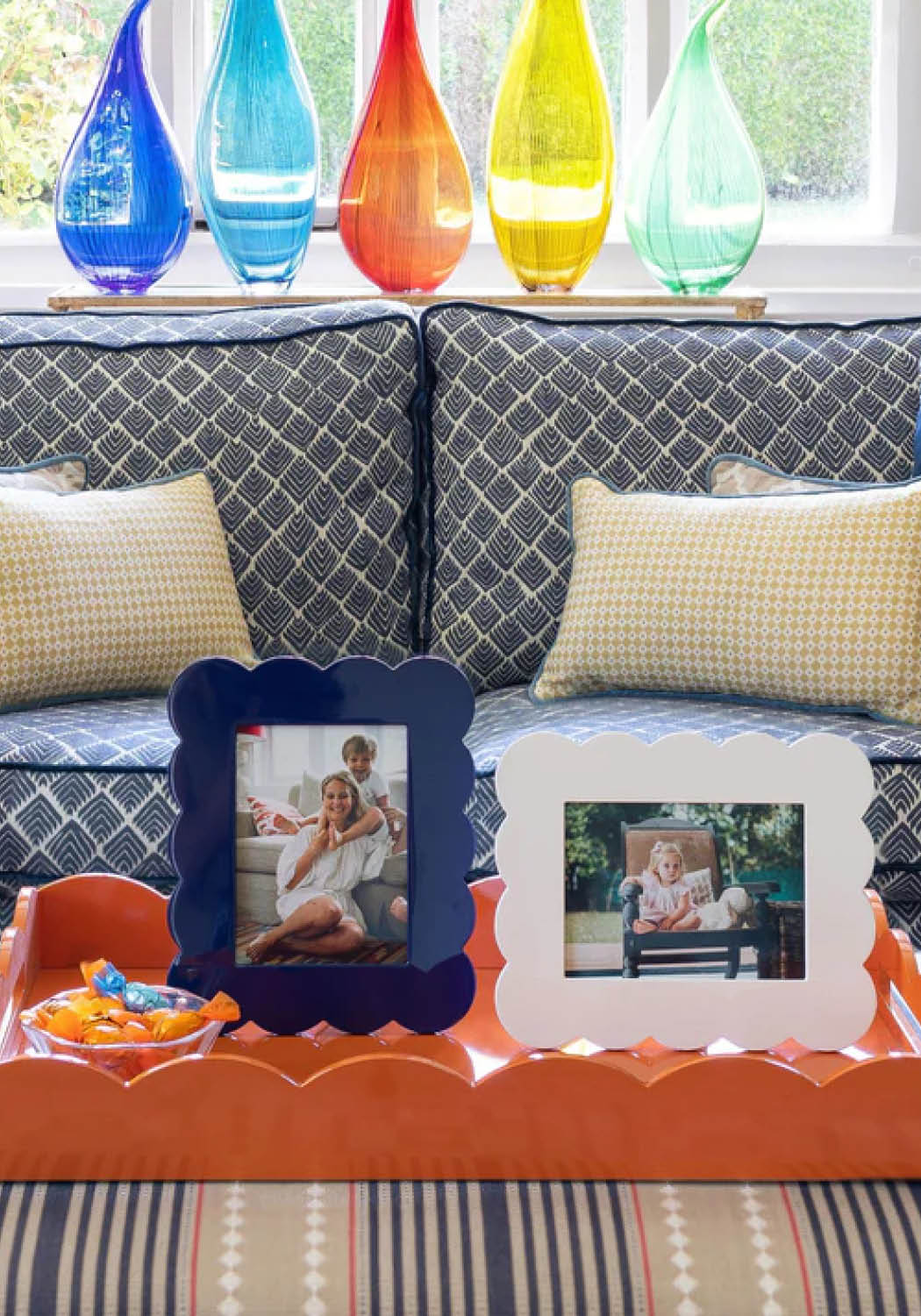 A fun collection of home fashion lacquered frames, scalloped trays and bobbin candle sticks.